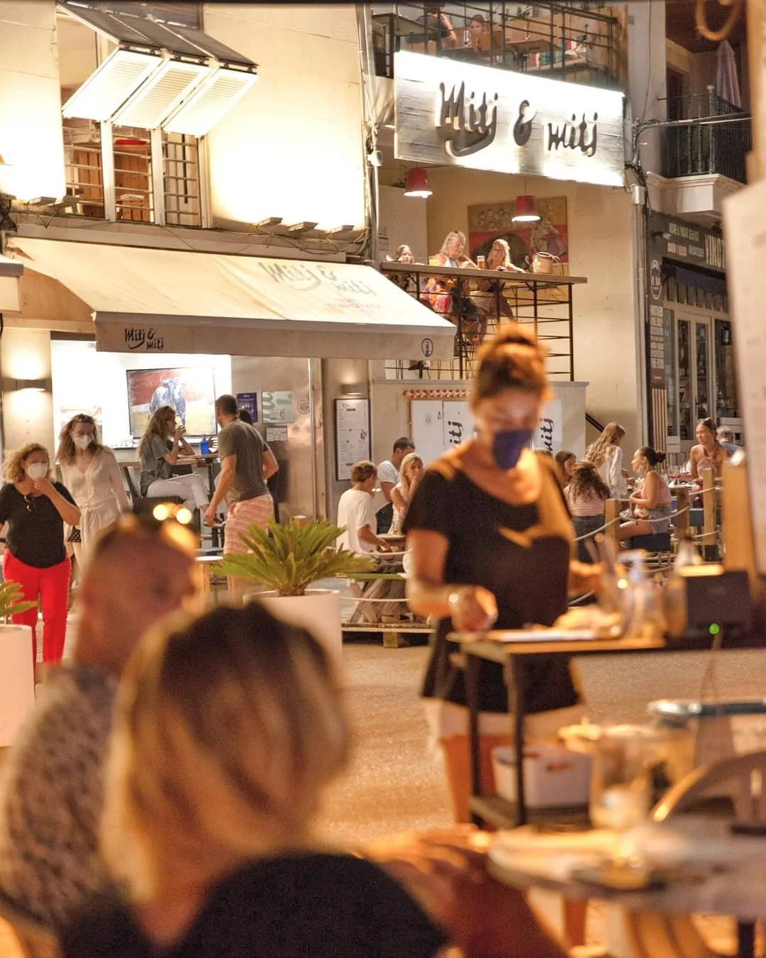 Mitj & Mitj es un lugar multicultural y multigeneracional, donde puedes elegir entre sentarte en el callejón del bar original, contemplar el ambiente desde el balcón o disfrutar del atardecer frente al mar. También puedes quedarte de pie, charlando con nuevos amigos en un ambiente relajado y social.